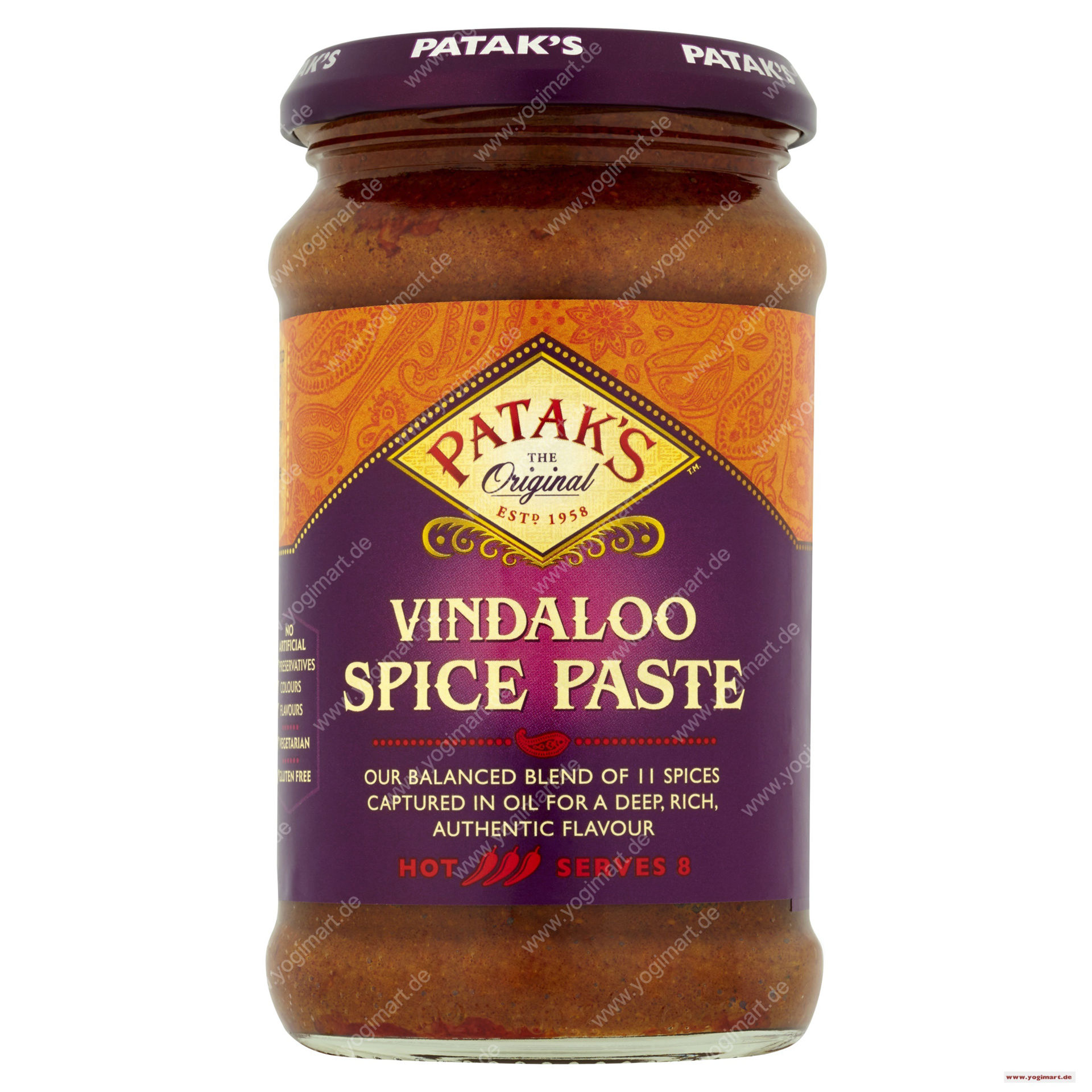 Ingredients: Water, ground spices (22%) [coriander, bell pepper, chilli, turmeric, spices, cinnamon, cumin], rapeseed oil, salt, corn flour, acidulant (acetic acid, citric acid, lactic acid), mustard powder, tamarind, ginger powder, garlic powder.